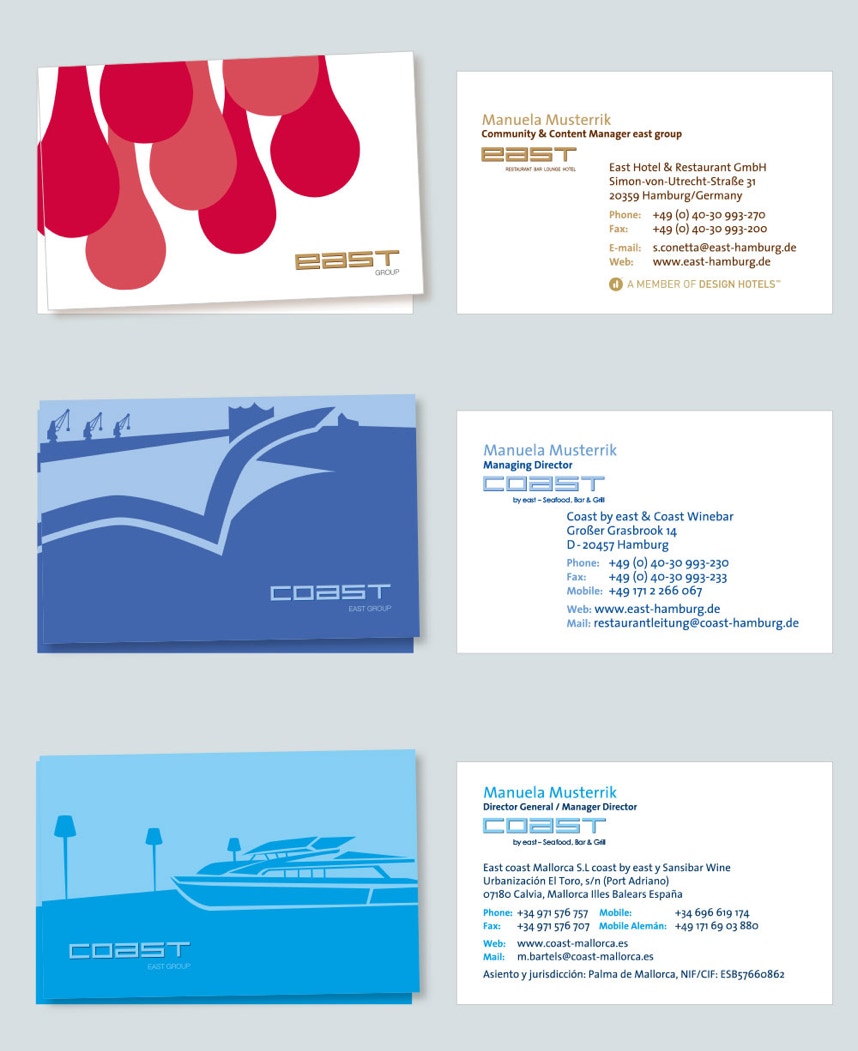 Geschäftsausstattung & Produktdesign | Für die East Group habe ich vier Visitenkarten gestaltet, jeweils für das Hotel und die drei Restaurants in Hamburg und Mallorca. Wir haben so gut miteinander gearbeitet, dass es mit tollen Produktdesigns für das East Hotel weiter ging. Das hat mich natürlich sehr gefreut.
