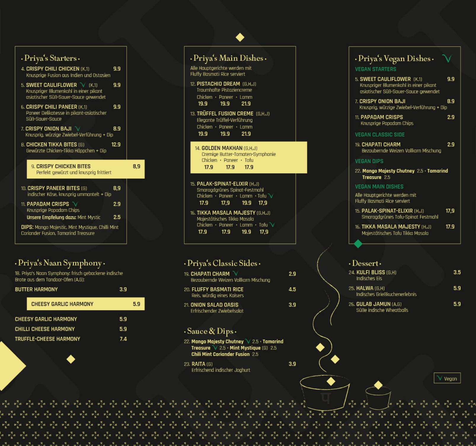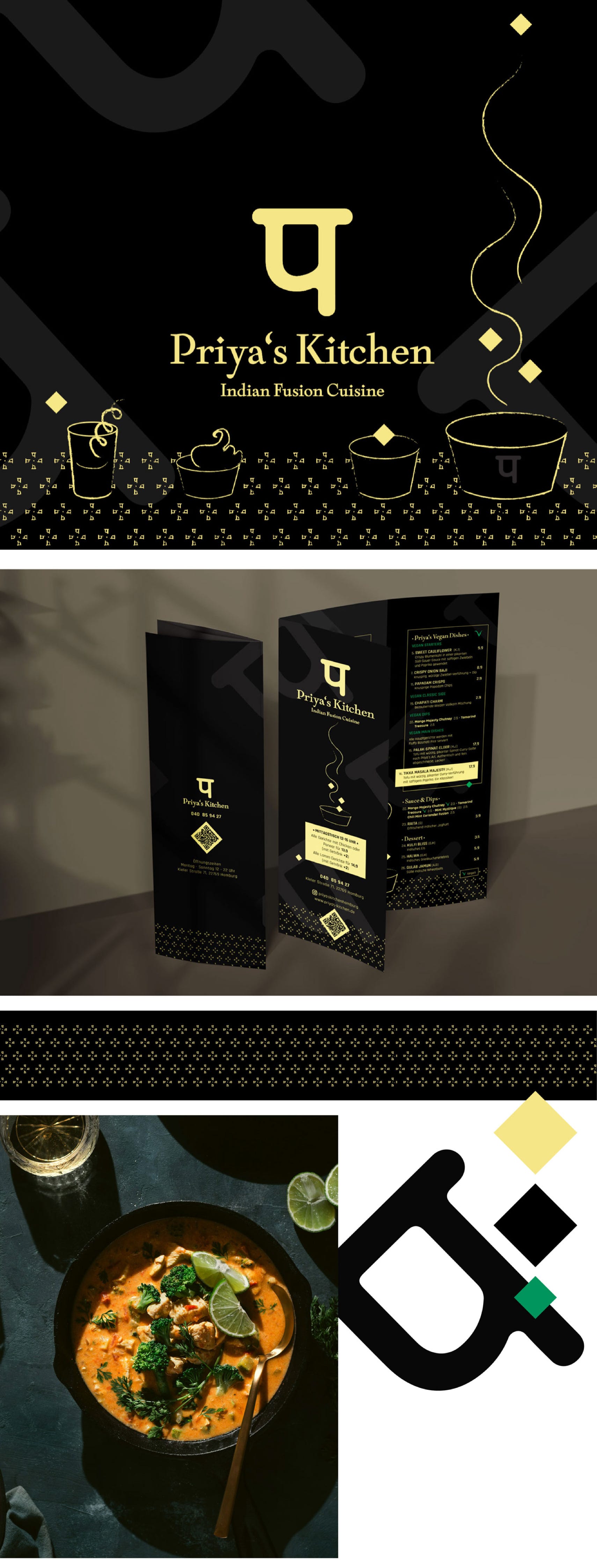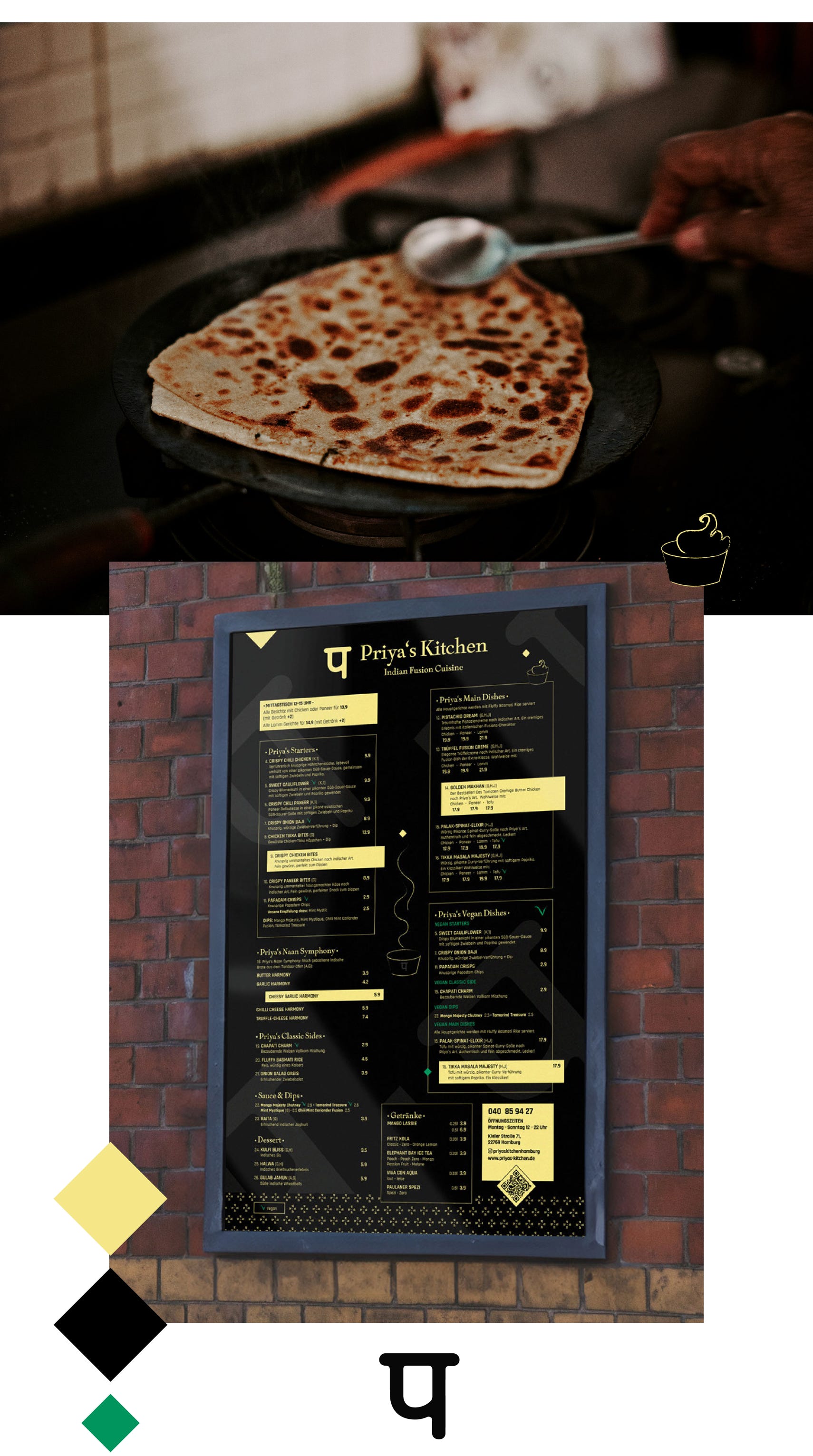 Menügestaltung | Priya's Kitchen – der indische Lieferservice um die Ecke, aber mit richtig feinen Fusionsgerichten. Die Jungs von Priya's Kitchen wollten das Besondere und genau das spiegelt sich auch in ihrer Menükarte wieder. Mit einem harmonischen Zusammenspiel aus ihrem mitgelieferten Logo und Farben, individuell gestalteten Küchen-Icons und den köstlichen Gerichten habe ich ein Design kreiert, das die Einzigartigkeit ihrer Fusionsküche unterstreicht.