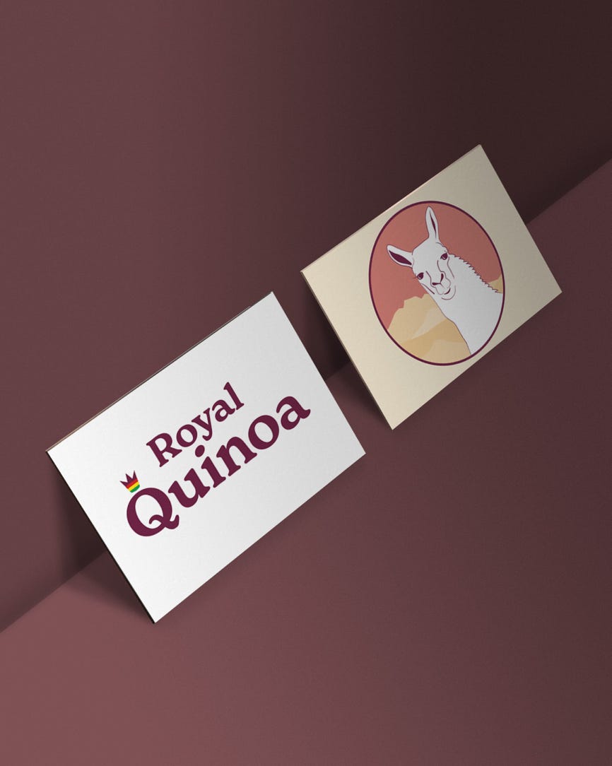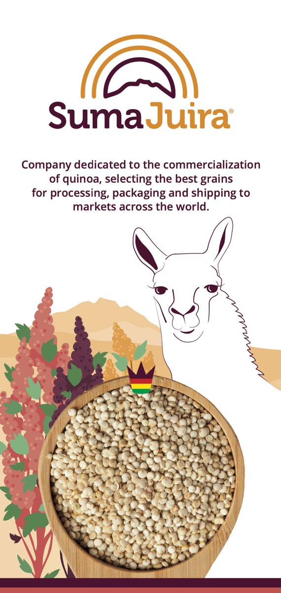 Etiketten & Messeaustattung | Für die Firma Suma Juira, die in Bolivien eine der besten Quinoa produziert und verkauft, habe ich das Markendesign für die Sorte „Royal Quinoa“ gestaltet, die 2022 auf der Biofachmesse in Nürnberg erfolgreich präsentiert wurde. Das Llama und die Farben der blühende Quinoapflanze, die hoch im Altiplano Boliviens wächst war meine erste Wahl um dieses Bolivianisches Produkt hervorzuheben.