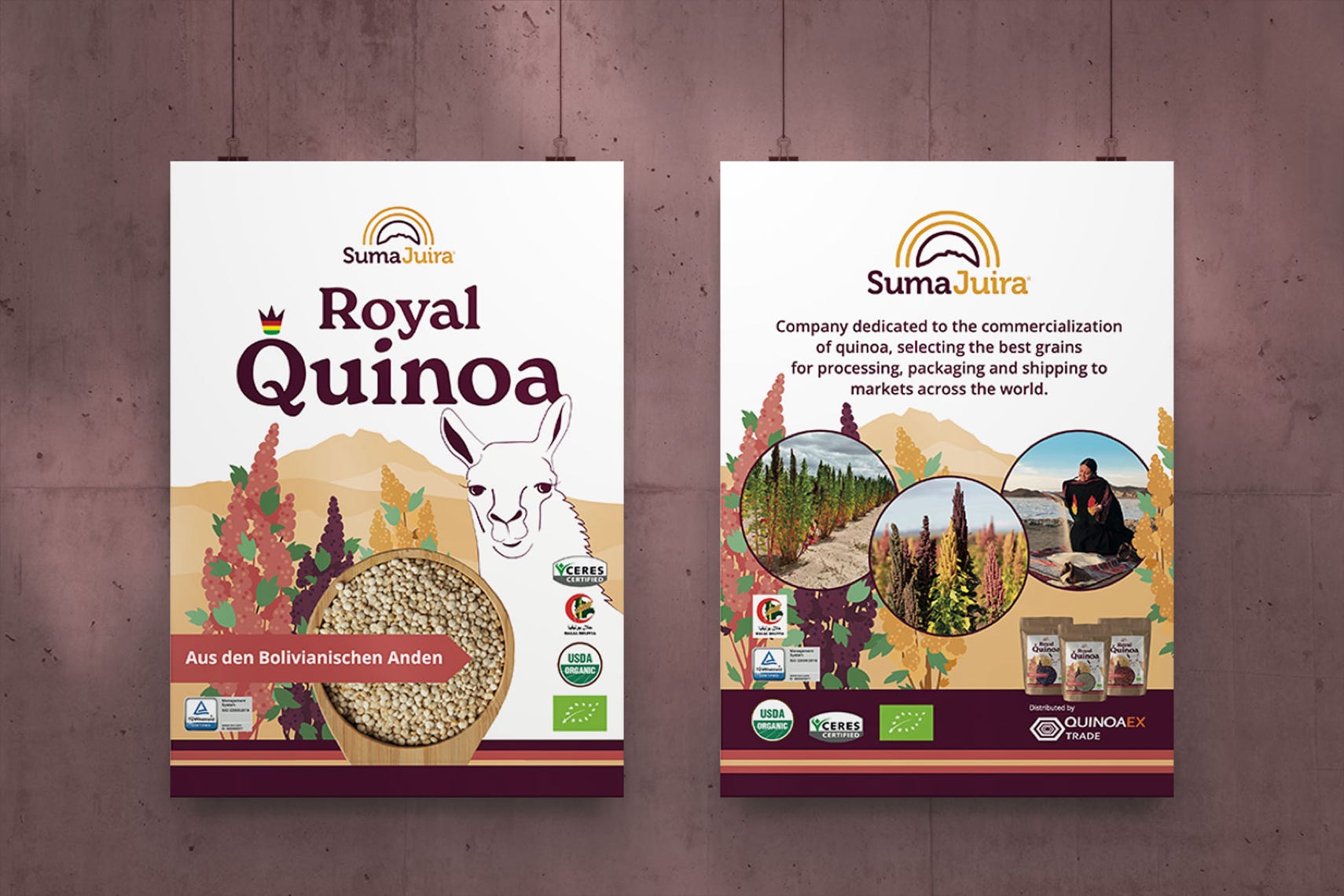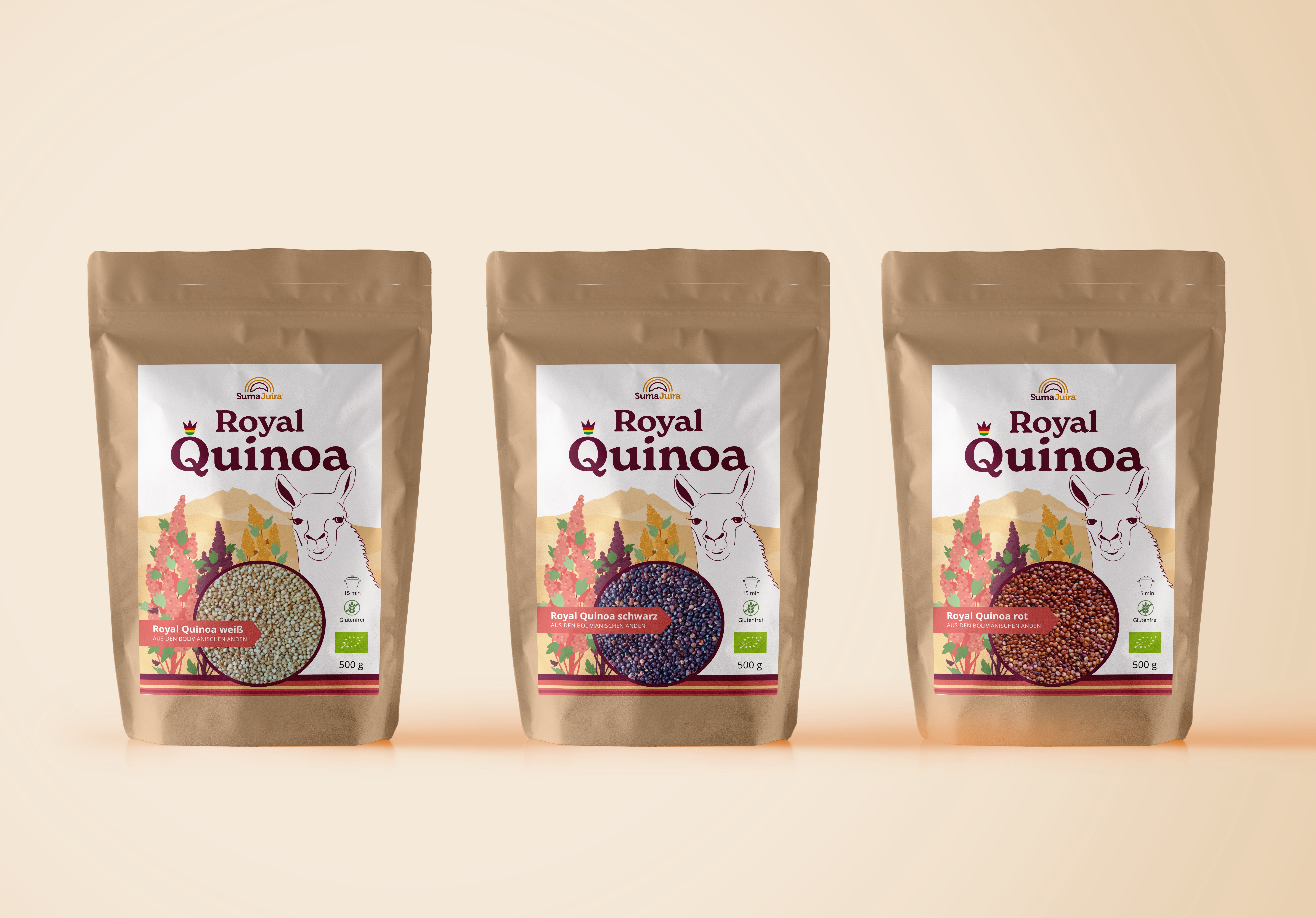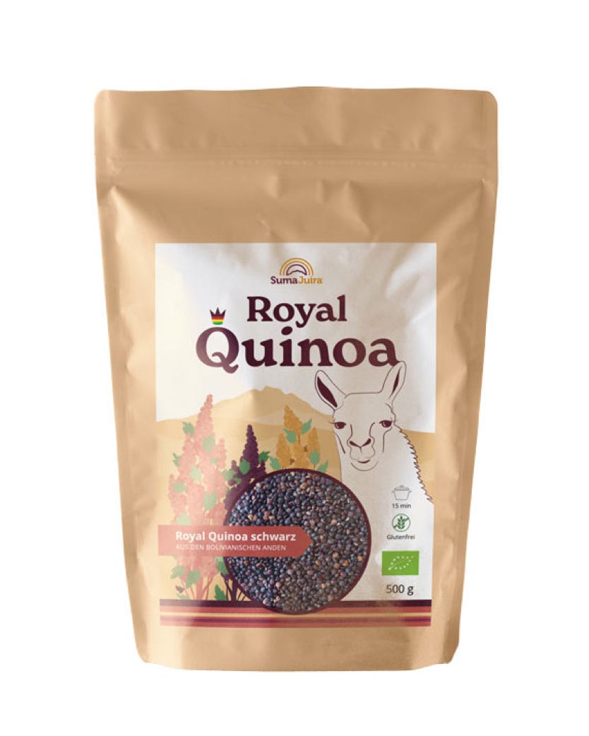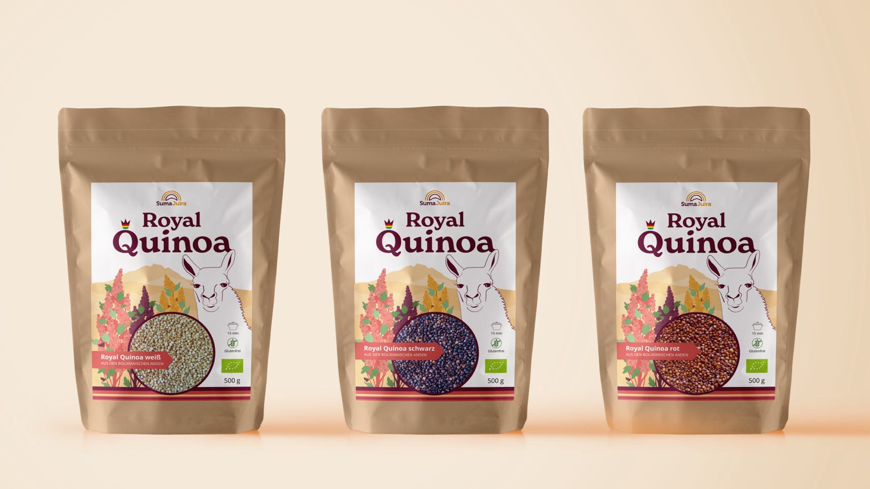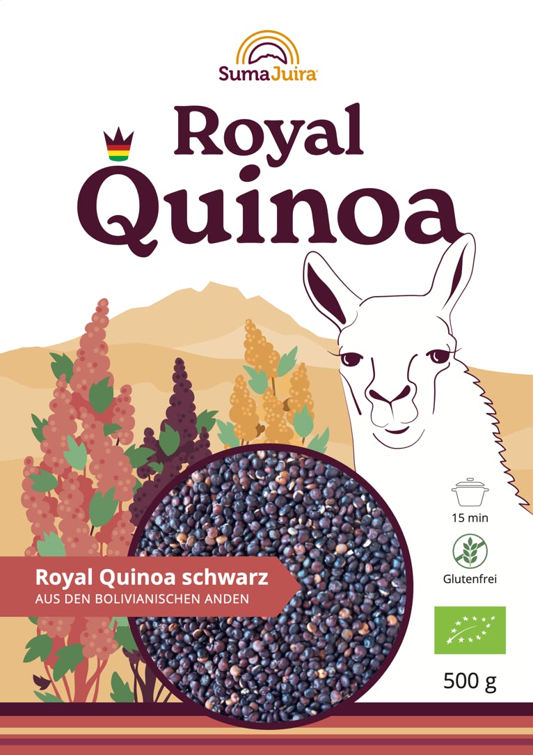 Etiketten & Messeaustattung | Für die Firma Suma Juira, die in Bolivien eine der besten Quinoa produziert und verkauft, habe ich das Markendesign für die Sorte „Royal Quinoa“ gestaltet, die 2022 auf der Biofachmesse in Nürnberg erfolgreich präsentiert wurde. Das Llama und die Farben der blühende Quinoapflanze, die hoch im Altiplano Boliviens wächst war meine erste Wahl um dieses Bolivianisches Produkt hervorzuheben.