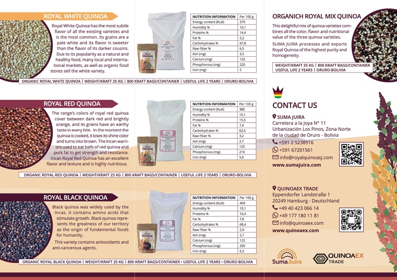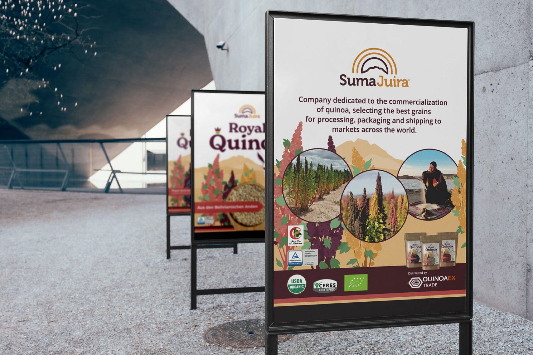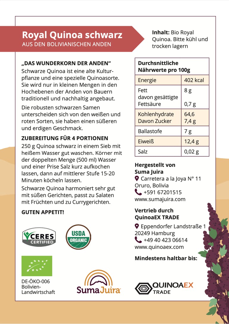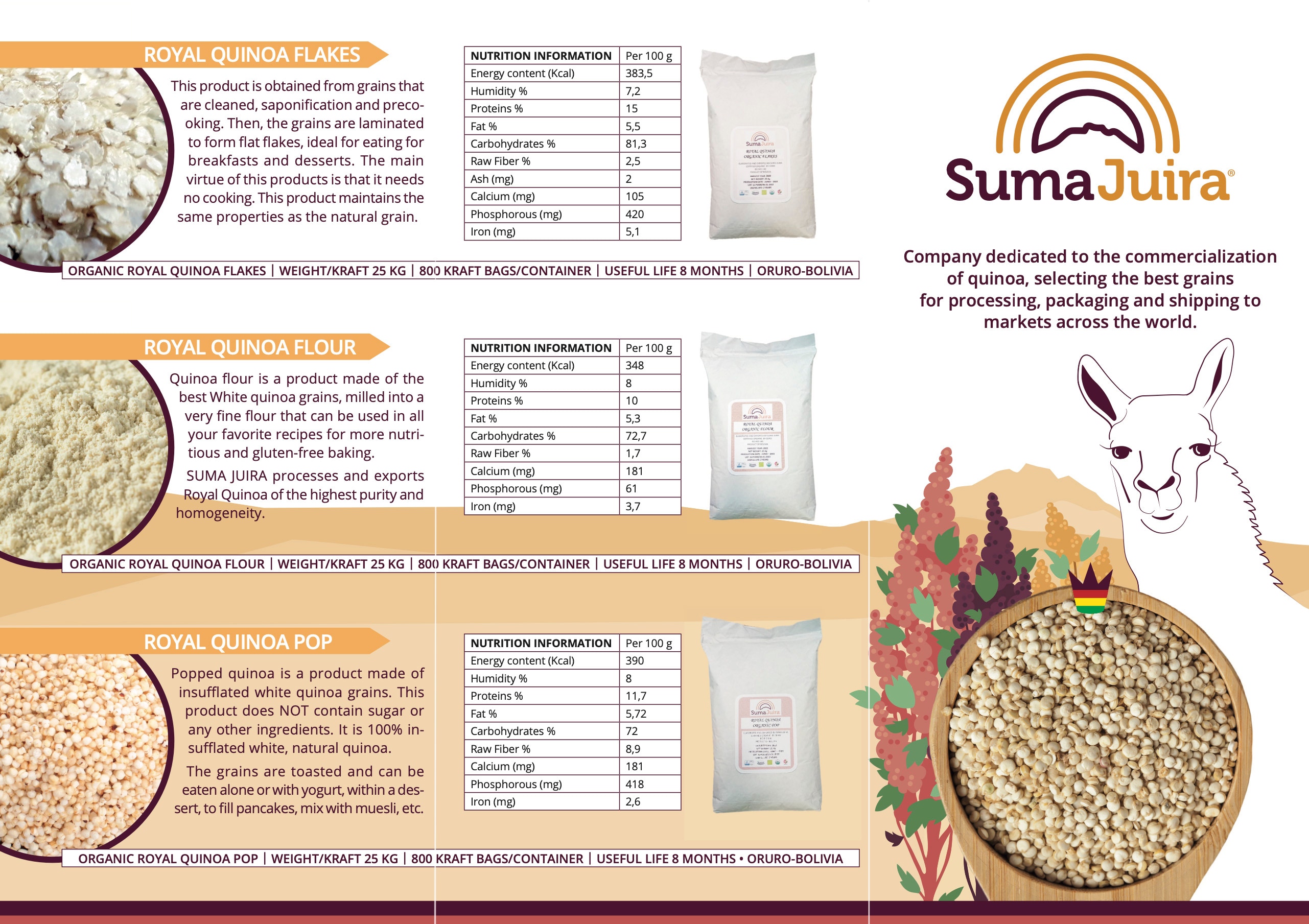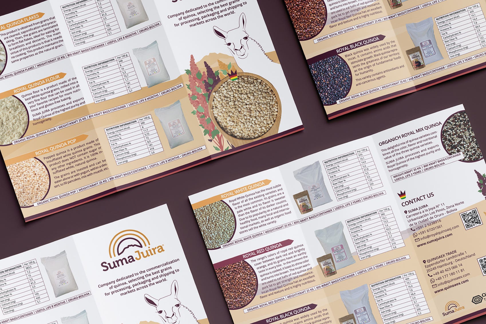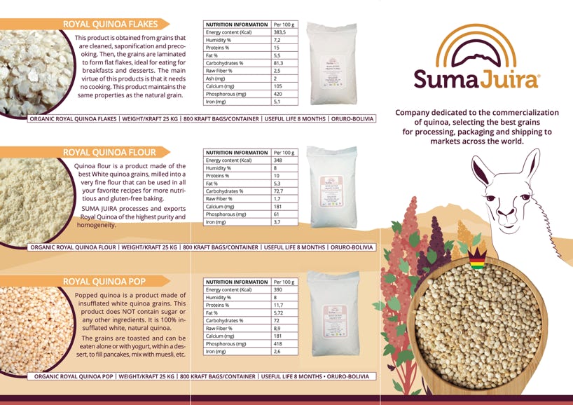 Etiketten & Messeaustattung | Für die Firma Suma Juira, die in Bolivien eine der besten Quinoa produziert und verkauft, habe ich das Markendesign für die Sorte „Royal Quinoa“ gestaltet, die 2022 auf der Biofachmesse in Nürnberg erfolgreich präsentiert wurde. Das Llama und die Farben der blühende Quinoapflanze, die hoch im Altiplano Boliviens wächst war meine erste Wahl um dieses Bolivianisches Produkt hervorzuheben.